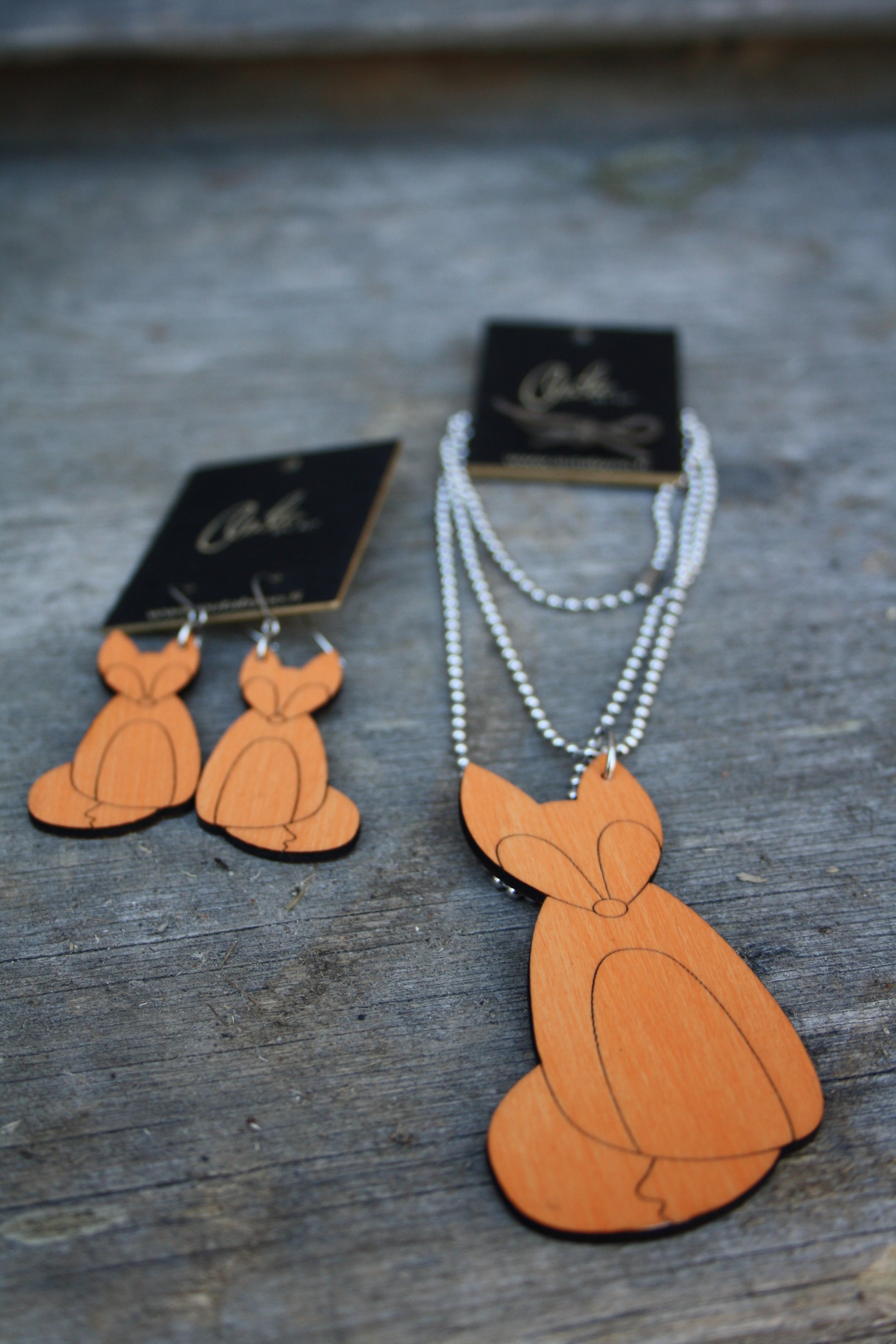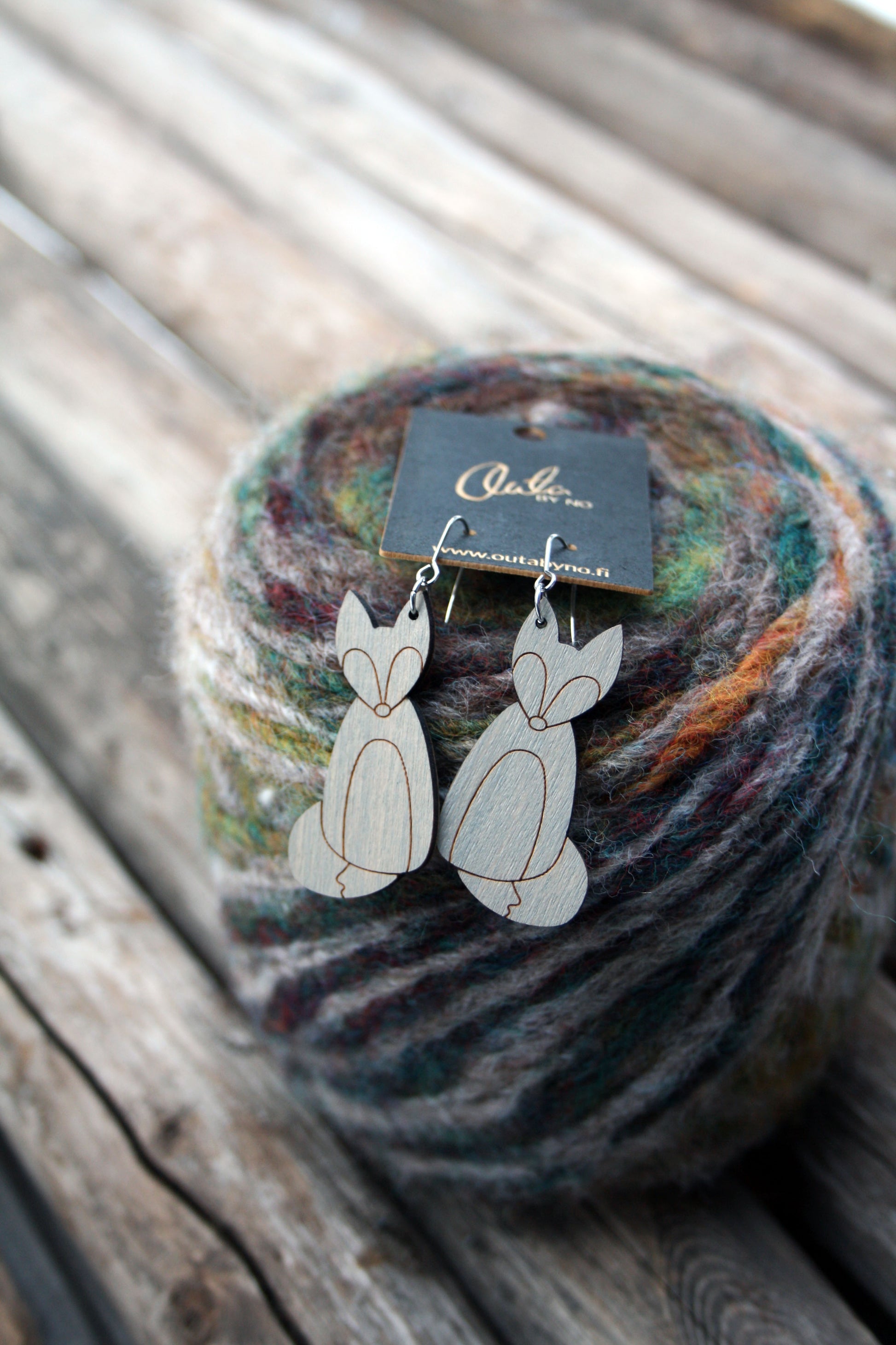Suomessa suunnitellut ja valmistetut korvakorut , joiden puuosat ovat käsiteltyä vaneria ja koruosat ruostumatonta terästä.